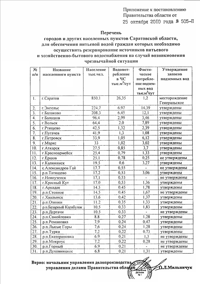 Постановление Правительства Саратовской области от 25.10.2010 N 505-П "Об утверждении Перечня городов и других населенных пунктов Саратовской области, для обеспечения питьевой водой граждан которых необходимо осуществить резервирование источников питьевого и хозяйственно-бытового водоснабжения на случай возникновения чрезвычайной ситуации"