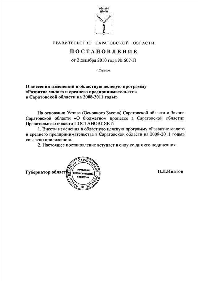 Постановление Правительства Саратовской области от 02.12.2010 N 607-П "О внесении изменений в областную целевую программу "Развитие малого и среднего предпринимательства в Саратовской области на 2008 - 2011 годы"