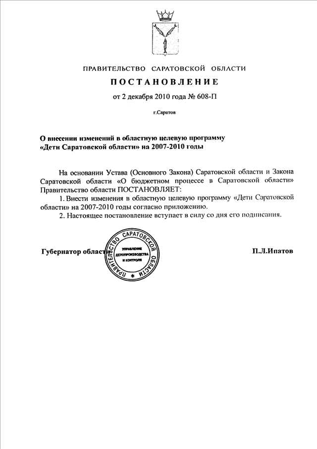 Постановление Правительства Саратовской области от 02.12.2010 N 608-П "О внесении изменений в областную целевую программу "Дети Саратовской области" на 2007 - 2010 годы"