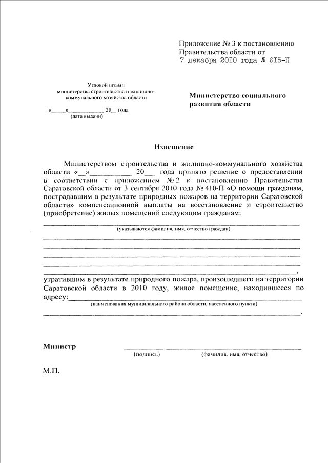 Постановление Правительства Саратовской области от 07.12.2010 N 615-П "О материальной помощи гражданам, утратившим жилые помещения в результате природных пожаров, произошедших на территории Саратовской области в 2010 году"