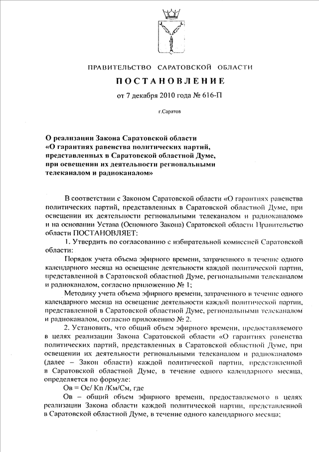 Постановление Правительства Саратовской области от 07.12.2010 N 616-П "О реализации Закона Саратовской области "О гарантиях равенства политических партий, представленных в Саратовской областной Думе, при освещении их деятельности региональными телеканалом и радиоканалом"