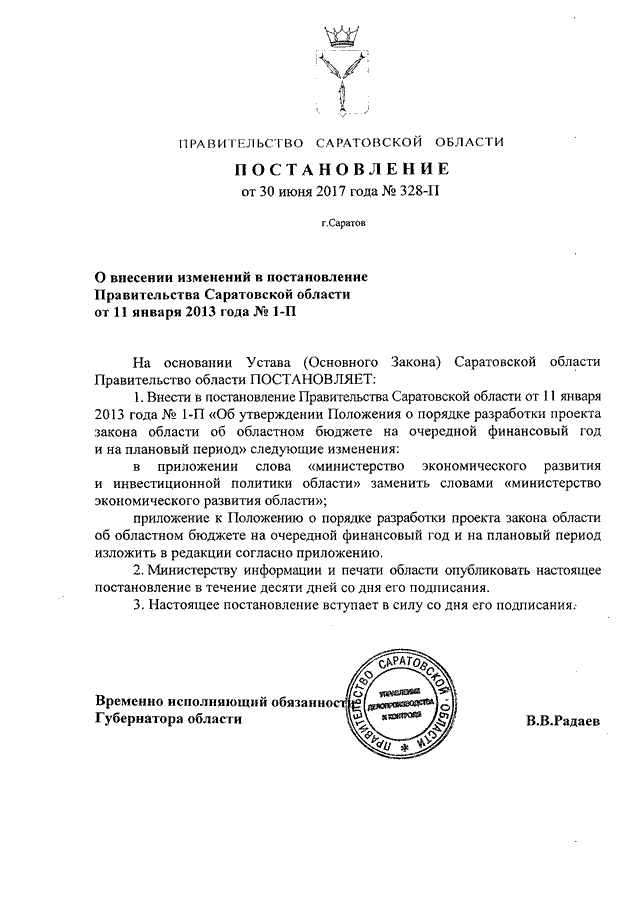 Постановление Правительства Саратовской области от 30.06.2017 N 328-П "О внесении изменений в постановление Правительства Саратовской области от 11 января 2013 года N 1-П"