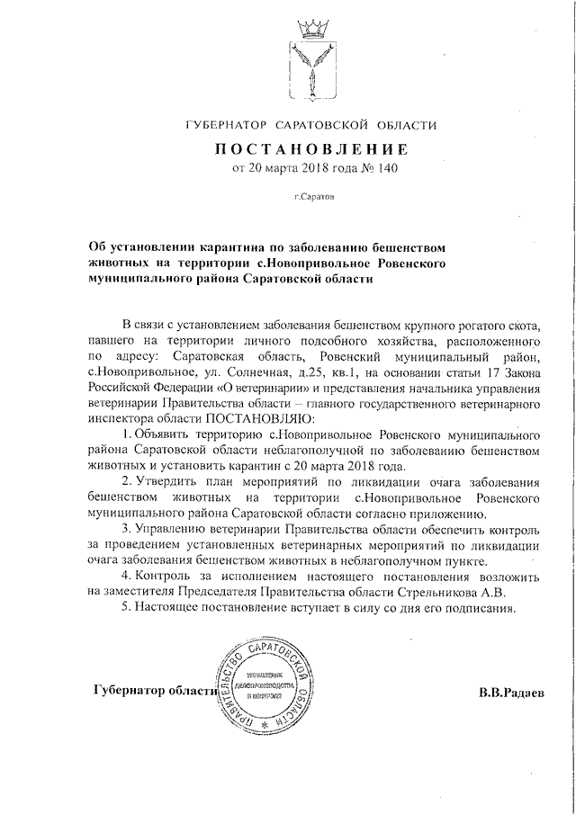 Постановление Губернатора Саратовской области от 20.03.2018 N 140 "Об установлении карантина по заболеванию бешенством животных на территории с. Новопривольное Ровенского муниципального района Саратовской области" (вместе с "Планом мероприятий по ликвидации очага заболевания бешенством животных на территории с. Новопривольное Ровенского муниципального района Саратовской области")