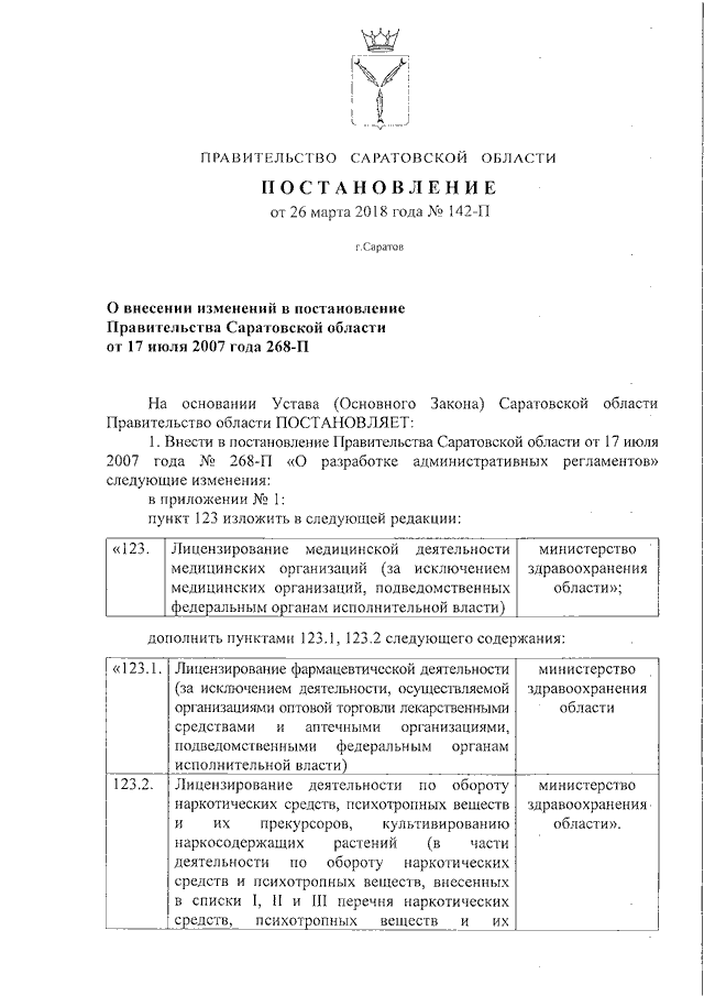 Постановление Правительства Саратовской области от 26.03.2018 N 142-П "О внесении изменений в постановление Правительства Саратовской области от 17 июля 2007 года 268-П"
