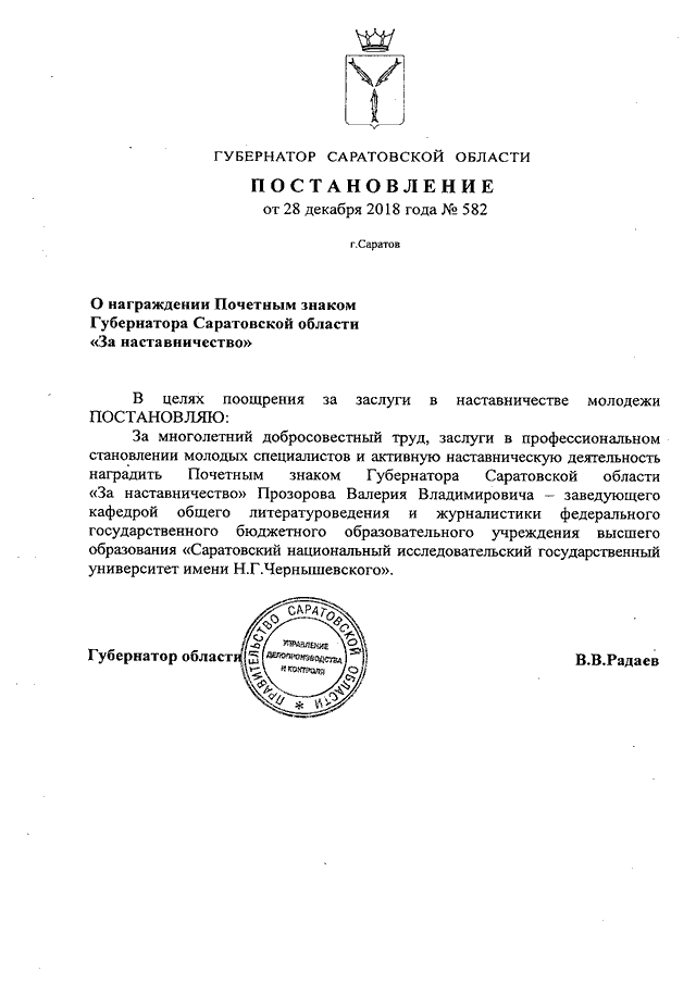 Постановление Губернатора Саратовской области от 28.12.2018 N 582 "О награждении Почетным знаком Губернатора Саратовской области "За наставничество"