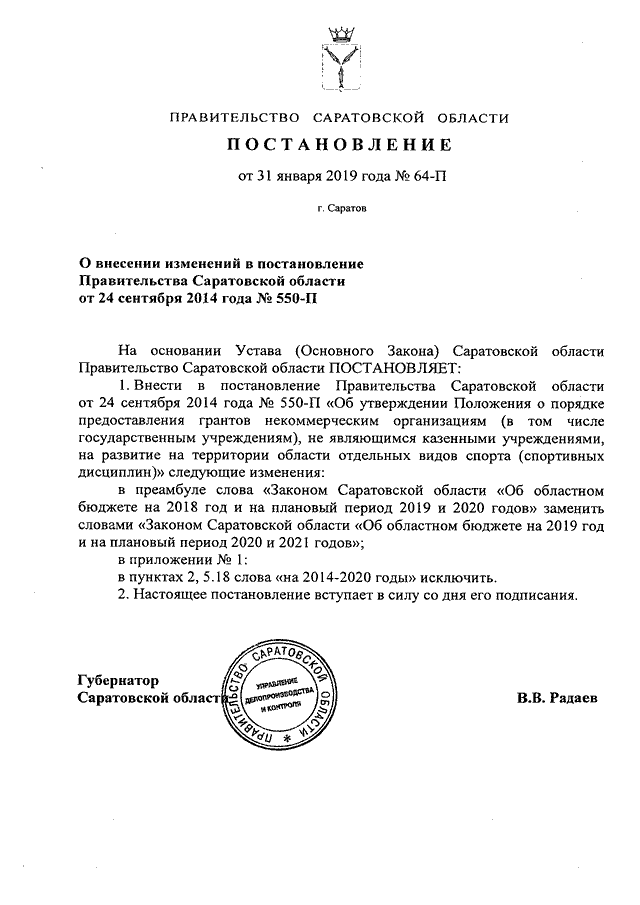 Постановление Правительства Саратовской области от 31.01.2019 N 64-П "О внесении изменений в постановление Правительства Саратовской области от 24 сентября 2014 года N 550-П"