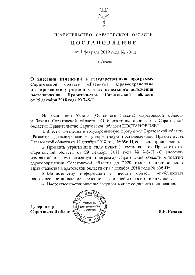 Постановление Правительства Саратовской области от 01.02.2019 N 70-П "О внесении изменений в государственную программу Саратовской области "Развитие здравоохранения" и о признании утратившим силу отдельного положения постановления Правительства Саратовской области от 29 декабря 2018 года N 748-П"