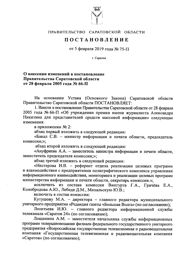 Постановление Правительства Саратовской области от 05.02.2019 N 75-П "О внесении изменений в постановление Правительства Саратовской области от 28 февраля 2005 года N 66-П"