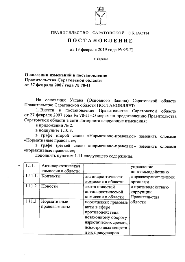 Постановление Правительства Саратовской области от 13.02.2019 N 95-П "О внесении изменений в постановление Правительства Саратовской области от 27 февраля 2007 года N 78-П"