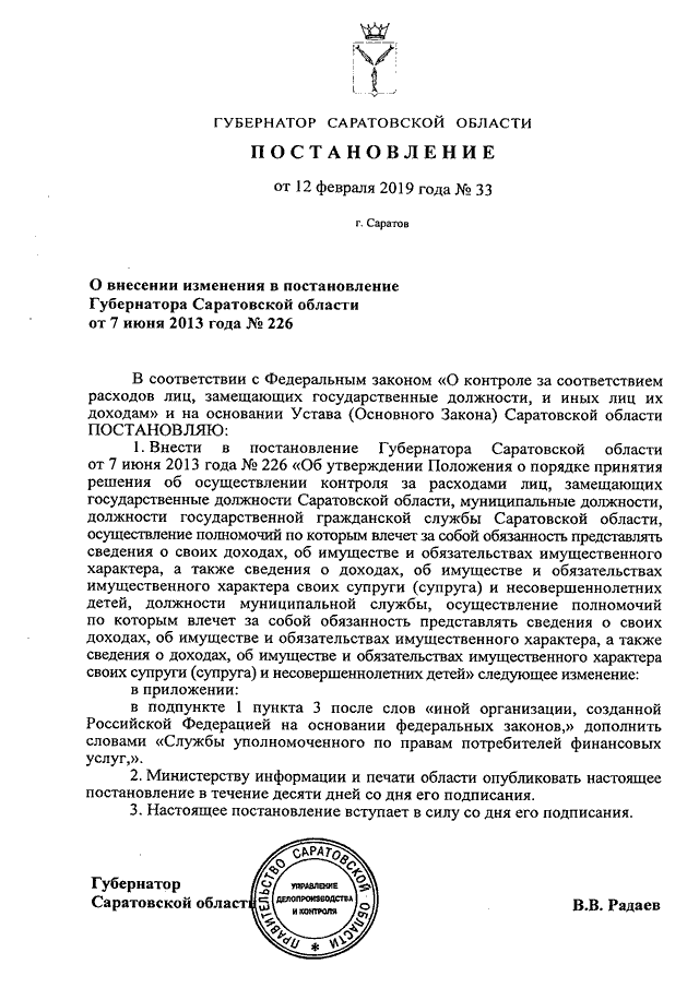 Постановление Губернатора Саратовской области от 12.02.2019 N 33 "О внесении изменения в постановление Губернатора Саратовской области от 7 июня 2013 года N 226"
