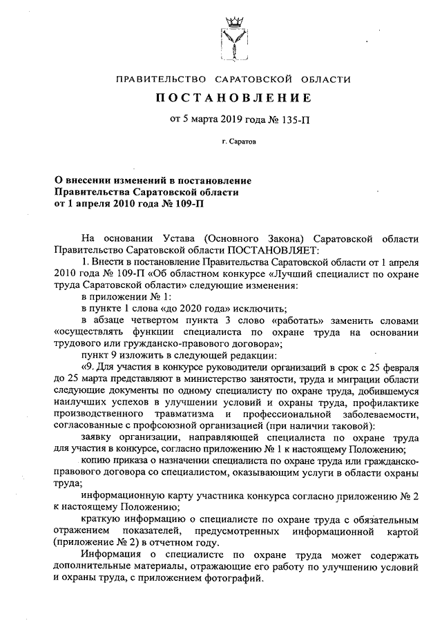 Постановление Правительства Саратовской области от 05.03.2019 N 135-П "О внесении изменений в постановление Правительства Саратовской области от 1 апреля 2010 года N 109-П"