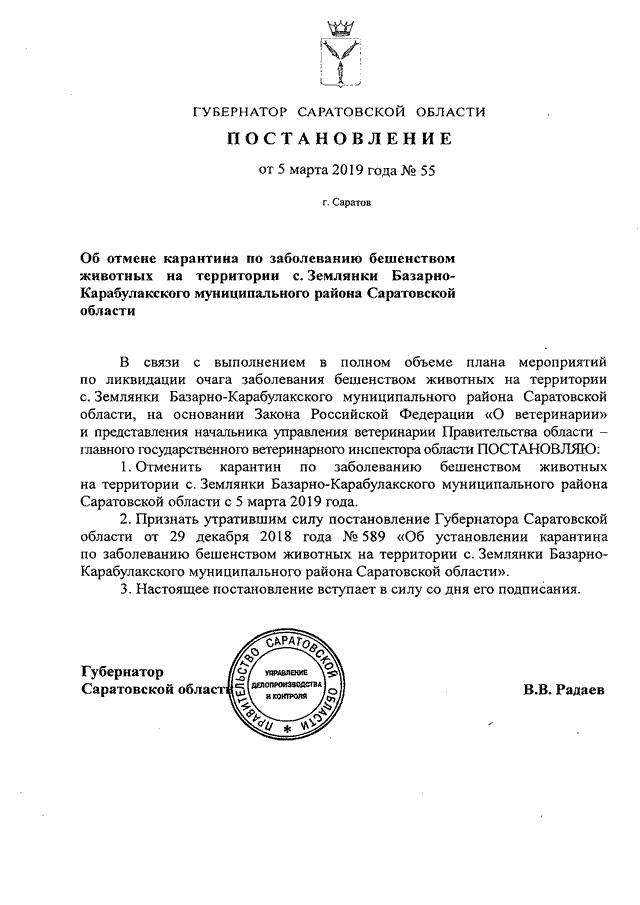 Постановление Губернатора Саратовской области от 05.03.2019 N 55 "Об отмене карантина по заболеванию бешенством животных на территории с. Землянки Базарно-Карабулакского муниципального района Саратовской области"