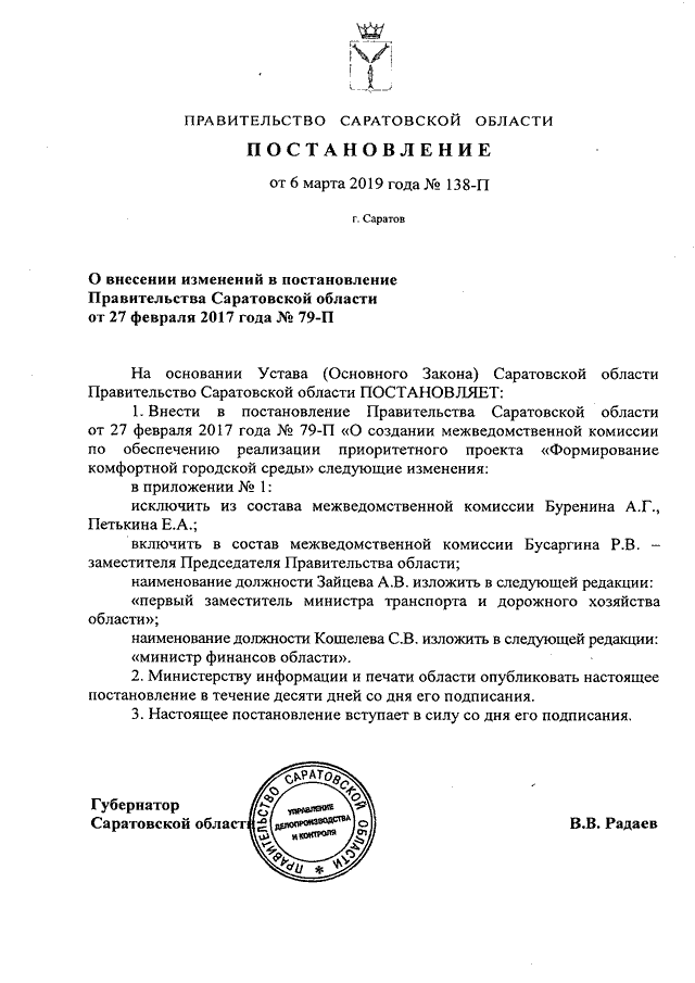 Постановление Правительства Саратовской области от 06.03.2019 N 138-П "О внесении изменений в постановление Правительства Саратовской области от 27 февраля 2017 года N 79-П"