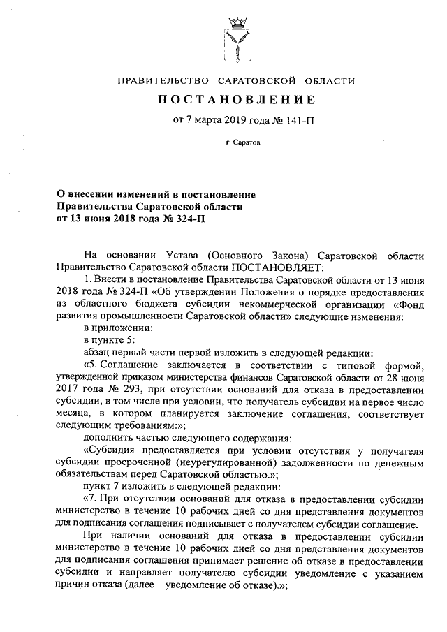 Постановление Правительства Саратовской области от 07.03.2019 N 141-П "О внесении изменений в постановление Правительства Саратовской области от 13 июня 2018 года N 324-П"