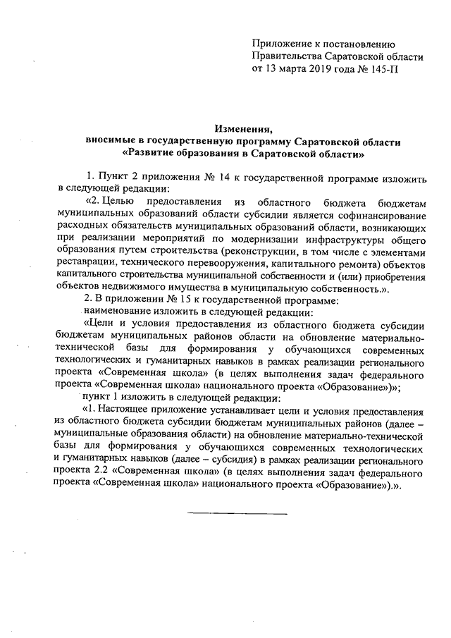 Постановление Правительства Саратовской области от 13.03.2019 N 145-П "О внесении изменений в государственную программу Саратовской области "Развитие образования в Саратовской области"