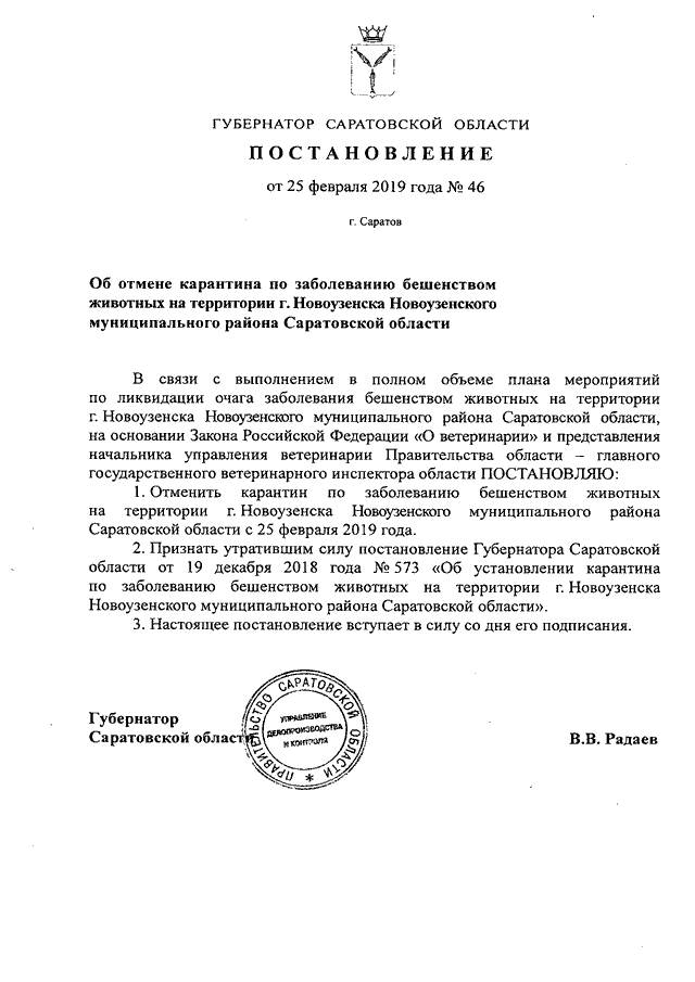 Постановление Губернатора Саратовской области от 25.02.2019 N 46 "Об отмене карантина по заболеванию бешенством животных на территории г. Новоузенска Новоузенского муниципального района Саратовской области"
