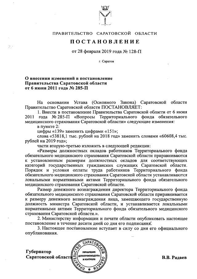 Постановление Правительства Саратовской области от 28.02.2019 N 128-П "О внесении изменений в постановление Правительства Саратовской области от 6 июня 2011 года N 285-П"