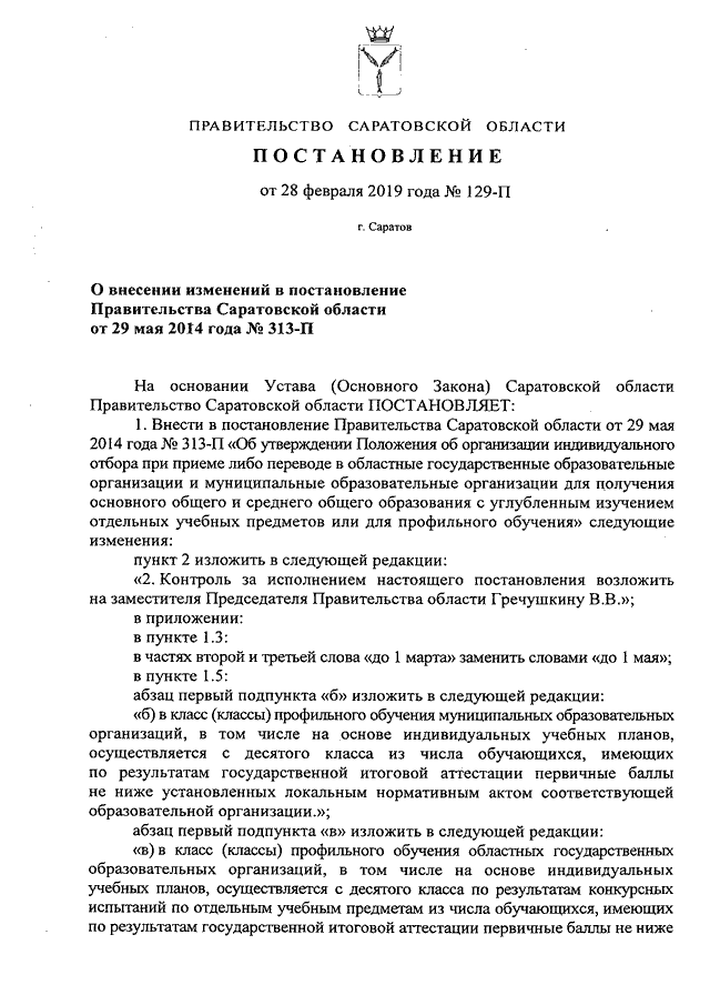 Постановление Правительства Саратовской области от 28.02.2019 N 129-П "О внесении изменений в постановление Правительства Саратовской области от 29 мая 2014 года N 313-П"