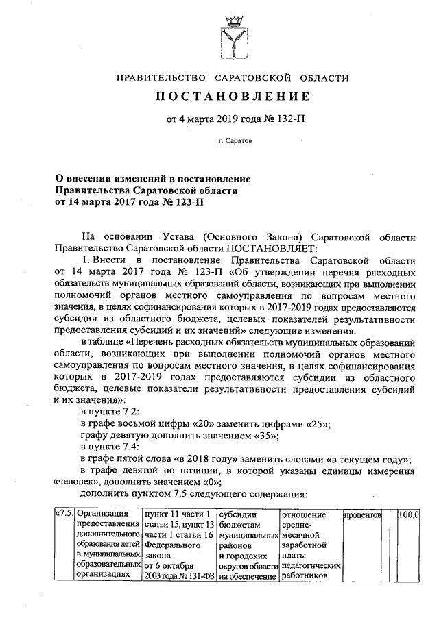 Постановление Правительства Саратовской области от 04.03.2019 N 132-П "О внесении изменений в постановление Правительства Саратовской области от 14 марта 2017 года N 123-П"