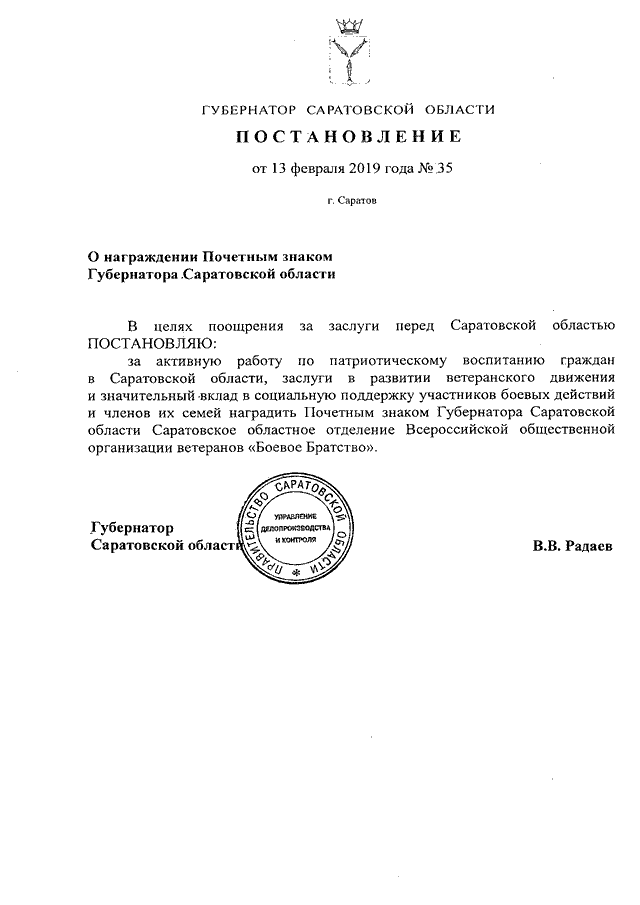 Постановление Губернатора Саратовской области от 13.02.2019 N 35 "О награждении Почетным знаком Губернатора Саратовской области"