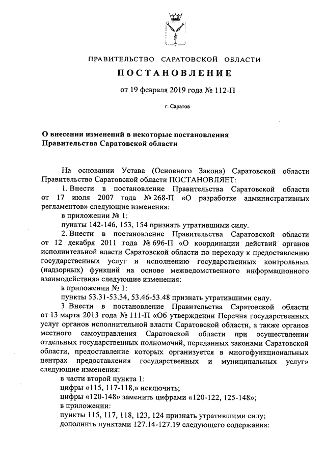 Постановление Правительства Саратовской области от 19.02.2019 N 112-П "О внесении изменений в некоторые постановления Правительства Саратовской области"