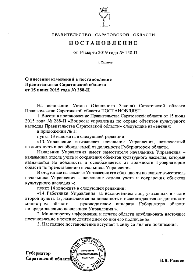 Постановление Правительства Саратовской области от 14.03.2019 N 158-П "О внесении изменений в постановление Правительства Саратовской области от 15 июня 2015 года N 288-П"