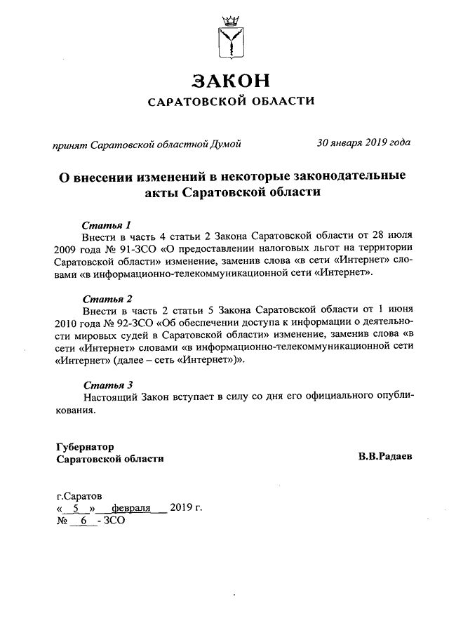 Закон Саратовской области от 05.02.2019 N 6-ЗСО "О внесении изменений в некоторые законодательные акты Саратовской области" (принят Саратовской областной Думой 30.01.2019)