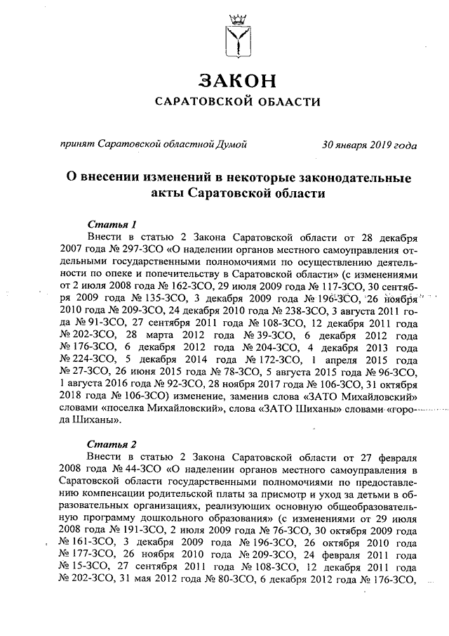 Закон Саратовской области от 05.02.2019 N 10-ЗСО "О внесении изменений в некоторые законодательные акты Саратовской области" (принят Саратовской областной Думой 30.01.2019)
