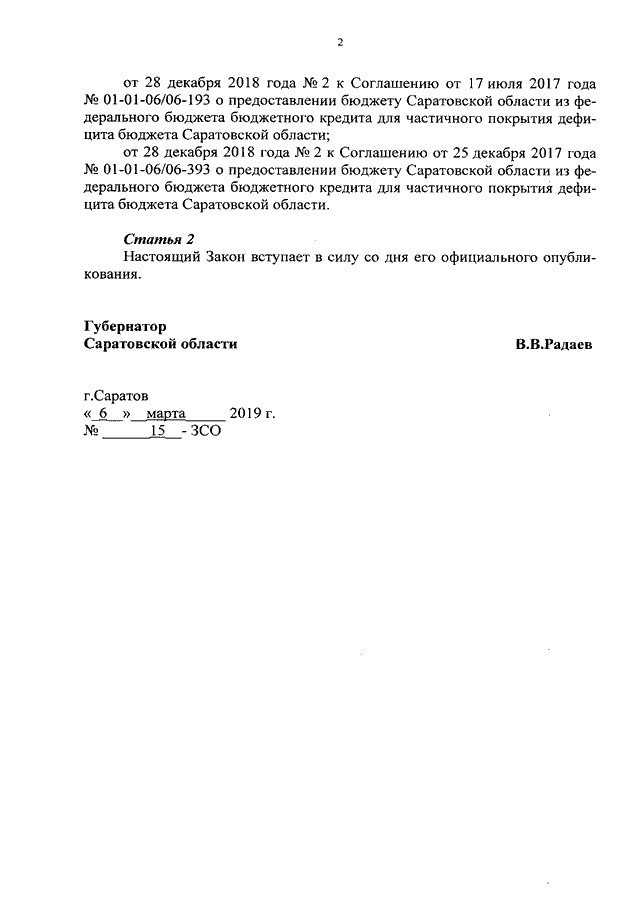 Закон Саратовской области от 06.03.2019 N 15-ЗСО "Об утверждении заключения дополнительных соглашений" (принят Саратовской областной Думой 27.02.2019)