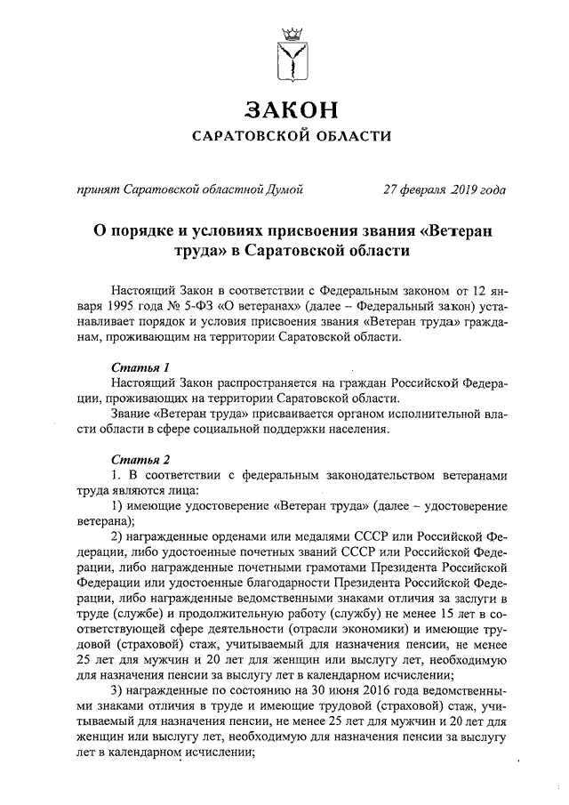 Закон Саратовской области от 06.03.2019 N 18-ЗСО "О порядке и условиях присвоения звания "Ветеран труда" в Саратовской области" (принят Саратовской областной Думой 27.02.2019)