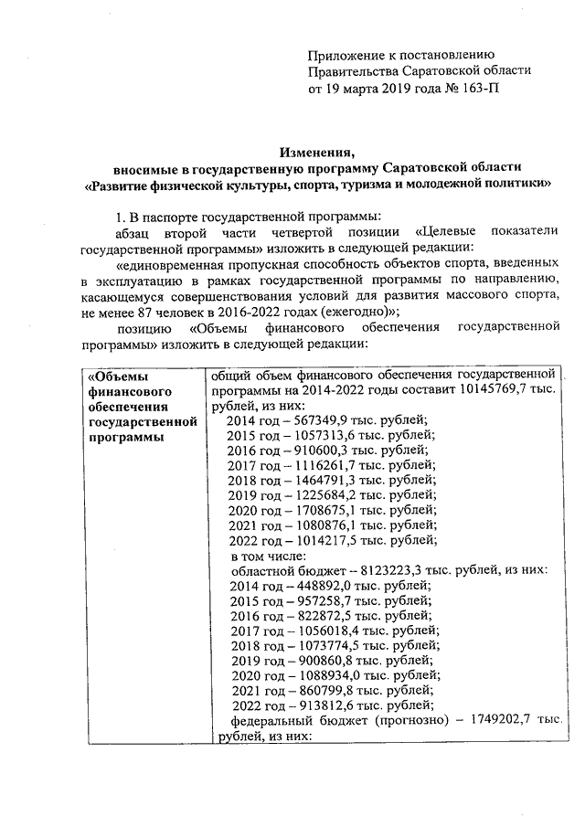 Постановление Правительства Саратовской области от 19.03.2019 N 163-П "О внесении изменений в государственную программу Саратовской области "Развитие физической культуры, спорта, туризма и молодежной политики"