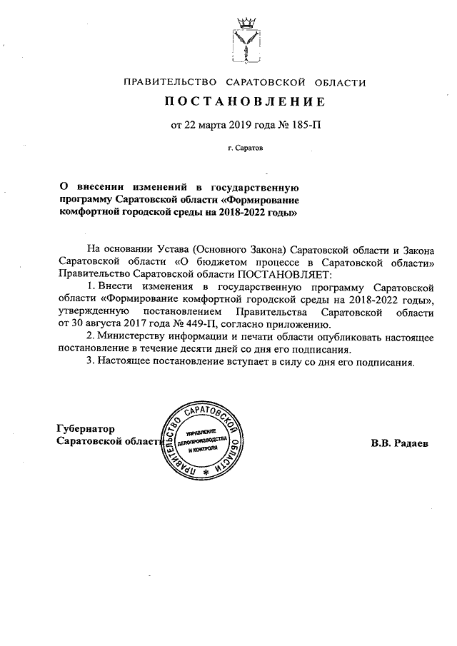 Постановление Правительства Саратовской области от 22.03.2019 N 185-П "О внесении изменений в государственную программу Саратовской области "Формирование комфортной городской среды на 2018 - 2022 годы"