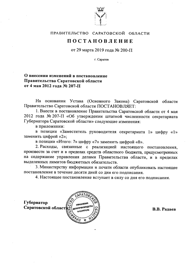 Постановление Правительства Саратовской области от 29.03.2019 N 200-П "О внесении изменений в постановление Правительства Саратовской области от 4 мая 2012 года N 207-П"