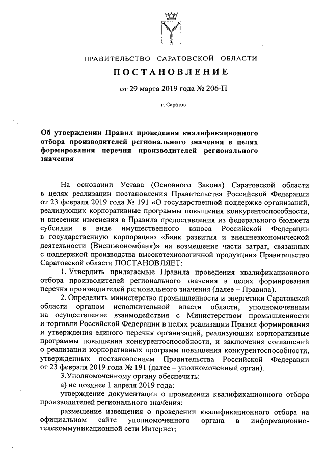 Постановление Правительства Саратовской области от 29.03.2019 N 206-П "Об утверждении Правил проведения квалификационного отбора производителей регионального значения в целях формирования перечня производителей регионального значения"
