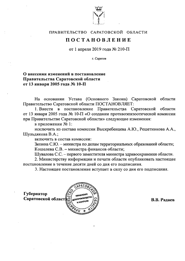 Постановление Правительства Саратовской области от 01.04.2019 N 210-П "О внесении изменений в постановление Правительства Саратовской области от 13 января 2005 года N 10-П"