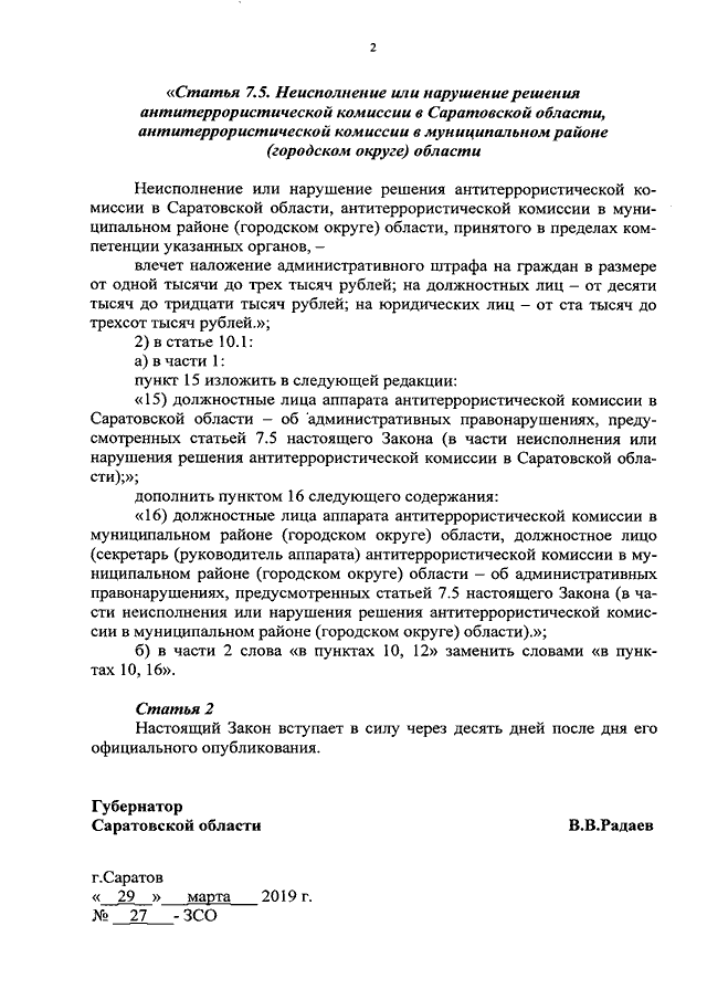Закон Саратовской области от 29.03.2019 N 27-ЗСО "О внесении изменений в статьи 7.5 и 10.1 Закона Саратовской области "Об административных правонарушениях на территории Саратовской области" (принят Саратовской областной Думой 22.03.2019)