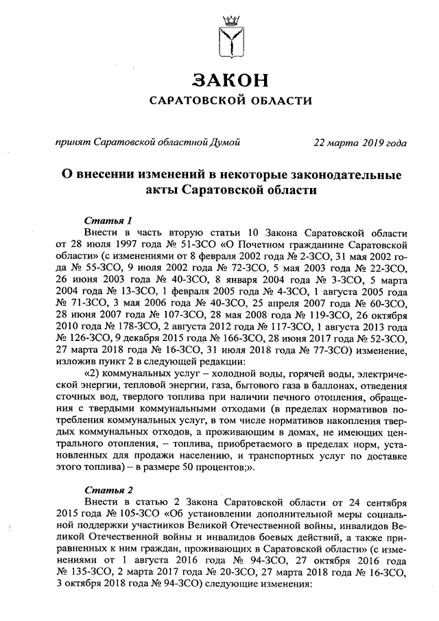 Закон Саратовской области от 29.03.2019 N 33-ЗСО "О внесении изменений в некоторые законодательные акты Саратовской области" (принят Саратовской областной Думой 22.03.2019)