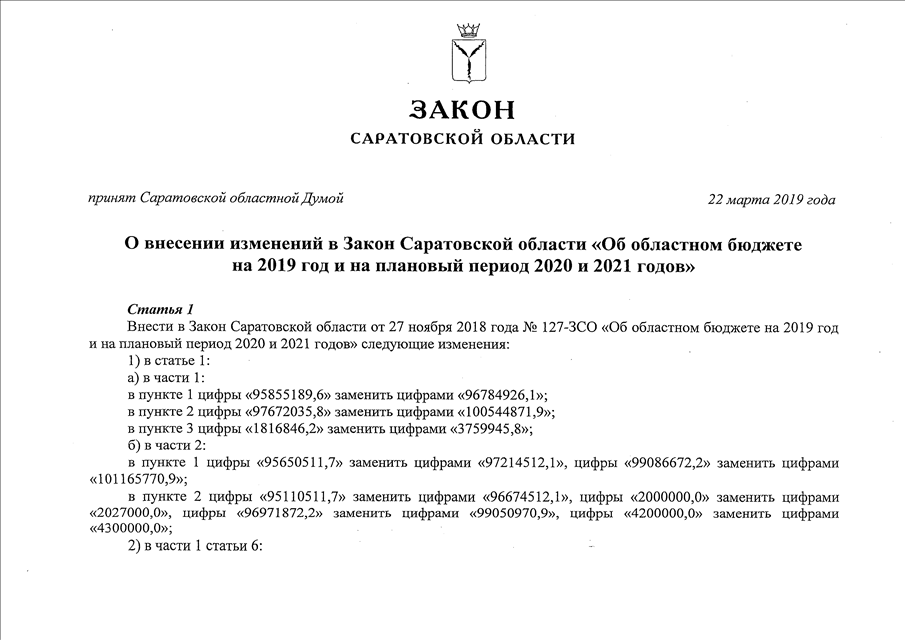 Закон Саратовской области от 29.03.2019 N 23-ЗСО "О внесении изменений в Закон Саратовской области "Об областном бюджете на 2019 год и на плановый период 2020 и 2021 годов" (принят Саратовской областной Думой 22.03.2019)
