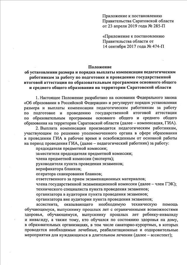 Постановление Правительства Саратовской области от 23.04.2019 N 285-П "О внесении изменений в постановление Правительства Саратовской области от 14 сентября 2017 года N 474-П" (вместе с "Положением об установлении размера и порядка выплаты компенсации педагогическим работникам за работу по подготовке и проведению государственной итоговой аттестации по образовательным программам основного общего и среднего общего образования на территории Саратовской области")