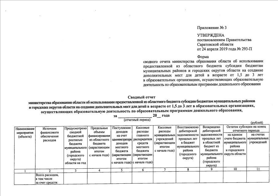 Постановление Правительства Саратовской области от 24.04.2019 N 293-П "О порядке предоставления из областного бюджета субсидии бюджетам муниципальных районов и городских округов области на создание дополнительных мест для детей в возрасте от 1,5 до 3 лет в образовательных организациях, осуществляющих образовательную деятельность по образовательным программам дошкольного образования, и условиях ее расходования" (вместе с "Положением о порядке предоставления из областного бюджета субсидии бюджетам муниципальных районов и городских округов области на создание дополнительных мест для детей в возрасте от 1,5 до 3 лет в образовательных организациях, осуществляющих образовательную деятельность по образовательным программам дошкольного образования, и условиях ее расходования")