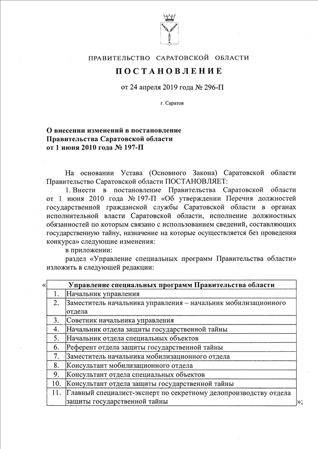 Постановление Правительства Саратовской области от 24.04.2019 N 296-П "О внесении изменений в постановление Правительства Саратовской области от 1 июня 2010 года N 197-П"