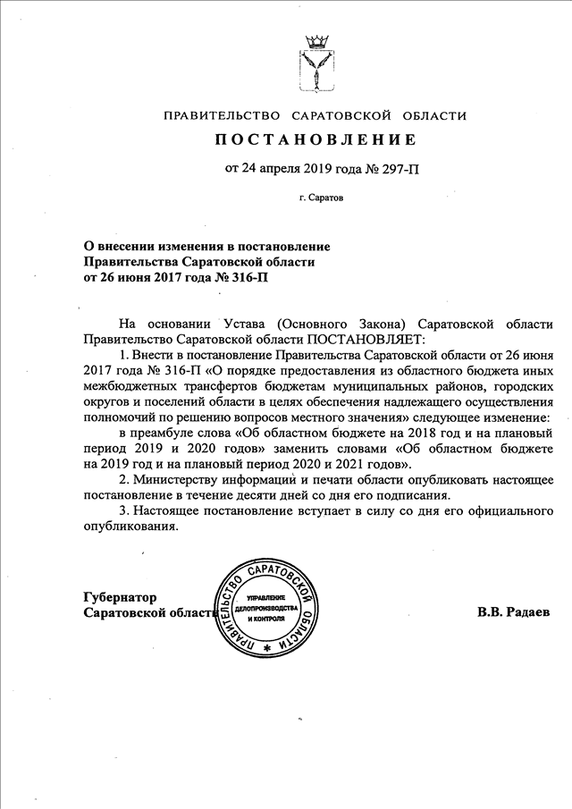 Постановление Правительства Саратовской области от 24.04.2019 N 297-П "О внесении изменения в постановление Правительства Саратовской области от 26 июня 2017 года N 316-П"