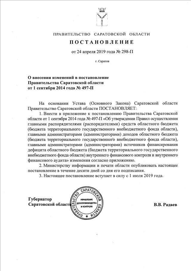 Постановление Правительства Саратовской области от 24.04.2019 N 298-П "О внесении изменений в постановление Правительства Саратовской области от 1 сентября 2014 года N 497-П"
