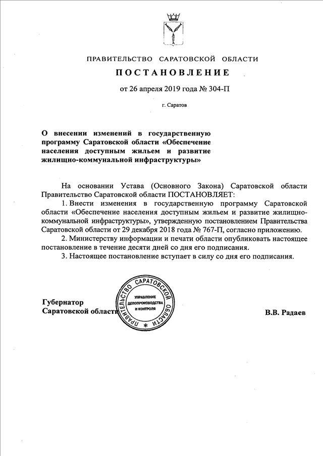 Постановление Правительства Саратовской области от 26.04.2019 N 304-П "О внесении изменений в государственную программу Саратовской области "Обеспечение населения доступным жильем и развитие жилищно-коммунальной инфраструктуры"