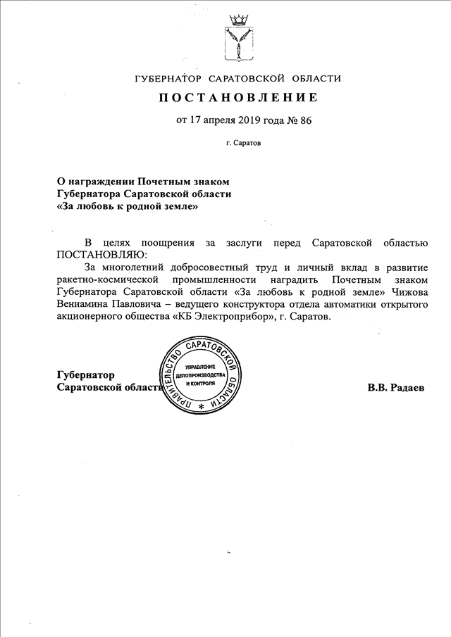 Постановление Губернатора Саратовской области от 17.04.2019 N 86 "О награждении Почетным знаком Губернатора Саратовской области "За любовь к родной земле"