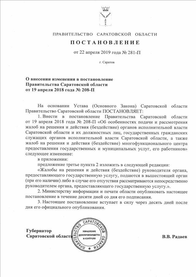 Постановление Правительства Саратовской области от 22.04.2019 N 281-П "О внесении изменения в постановление Правительства Саратовской области от 19 апреля 2018 года N 208-П"