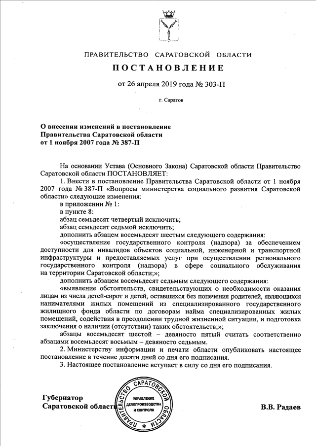 Постановление Правительства Саратовской области от 26.04.2019 N 303-П "О внесении изменений в постановление Правительства Саратовской области от 1 ноября 2007 года N 387-П"