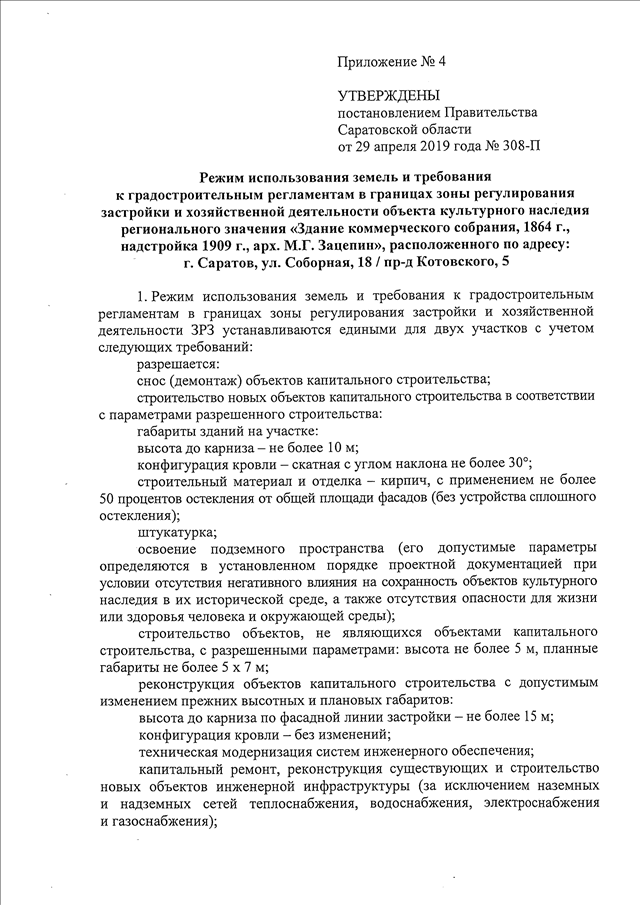 Постановление Правительства Саратовской области от 29.04.2019 N 308-П "Об утверждении зон охраны объекта культурного наследия регионального значения "Здание коммерческого собрания, 1864 г., надстройка 1909 г., арх. М.Г. Зацепин", расположенного по адресу: г. Саратов, ул. Соборная, 18/пр-д Котовского, 5"