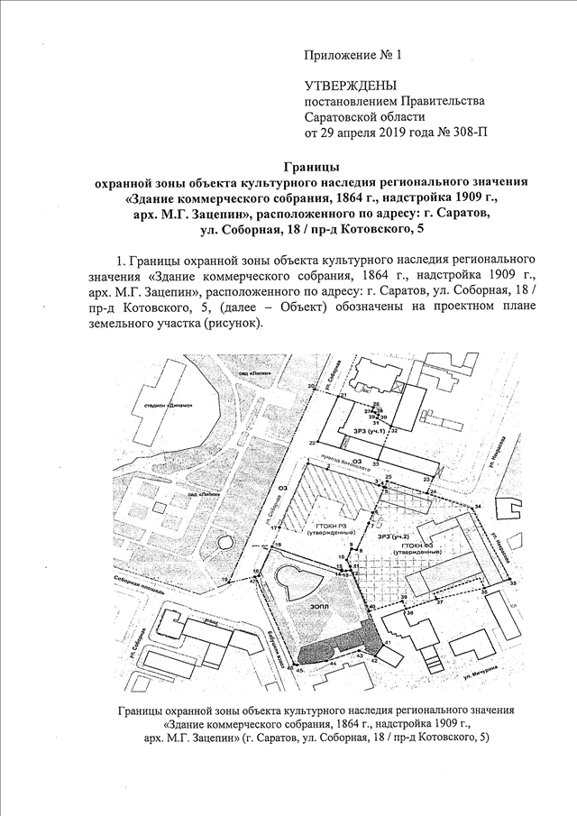 Постановление Правительства Саратовской области от 29.04.2019 N 308-П "Об утверждении зон охраны объекта культурного наследия регионального значения "Здание коммерческого собрания, 1864 г., надстройка 1909 г., арх. М.Г. Зацепин", расположенного по адресу: г. Саратов, ул. Соборная, 18/пр-д Котовского, 5"