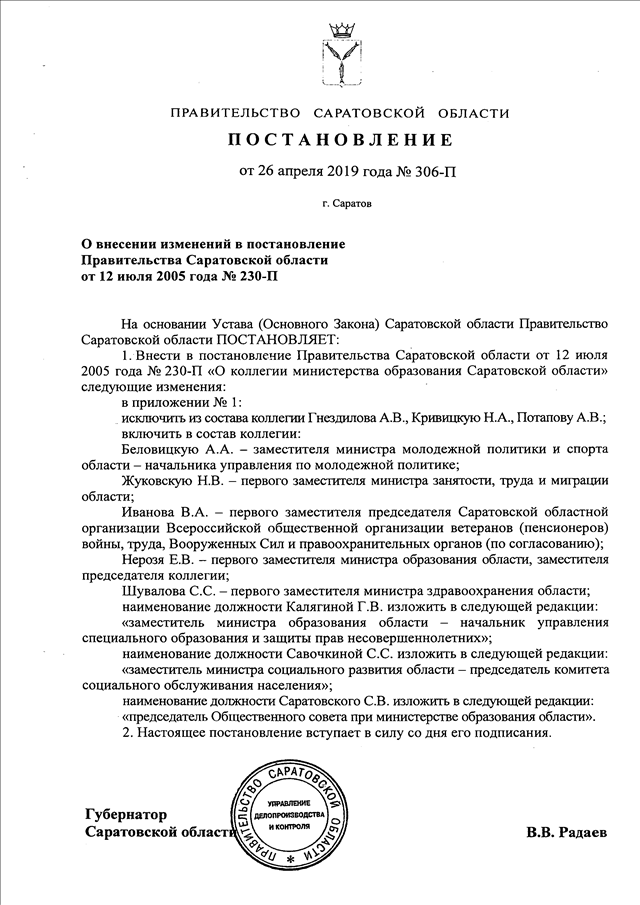 Постановление Правительства Саратовской области от 26.04.2019 N 306-П "О внесении изменений в постановление Правительства Саратовской области от 12 июля 2005 года N 230-П"